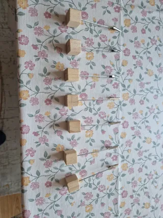 Set de siete soportes con base de madera y pinza metálica. - Base de madera. - Pinza metálica.