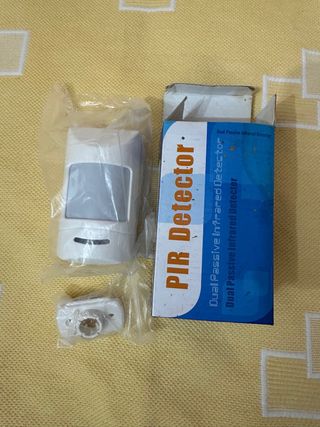 Detector de movimiento PIR (Passive Infrared) con tecnología de infrarrojos dual. Incluye el detector principal y un soporte. - Diseño compacto y blanco. - Ideal para sistemas de seguridad.