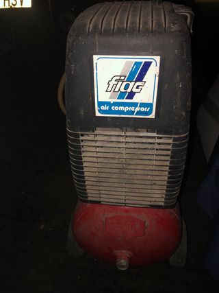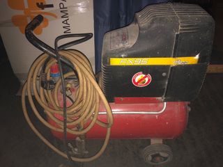 Compresor de aire marca FX95, modelo Oilless. - Tanque de aire rojo. - Cubierta superior negra. - Manguera enrollada. - Ruedas para movilidad.