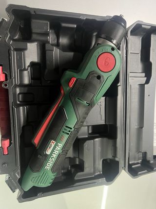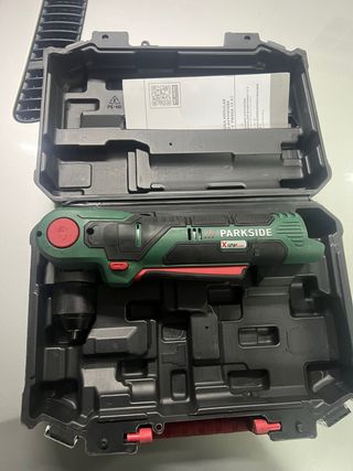 Taladro angular Parkside en su maletín original. Nunca usado - Modelo: PWBSA 12 A1. - Voltaje: 12V. - Incluye maletín de transporte.