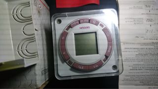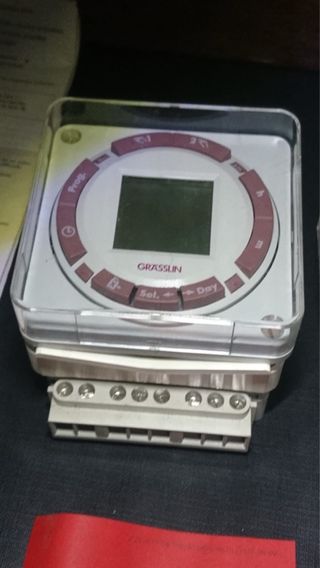 Temporizador digital Grasslin con pantalla y botones de control. - Diseño circular con botones. - Pantalla digital. - Conexiones en la parte inferior.