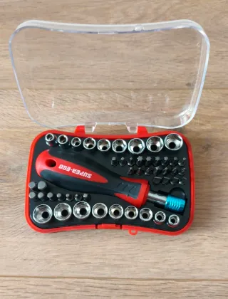 Práctico juego de destornillador con múltiples puntas. 48 piezas. - Mango ergonómico rojo y negro. - Incluye variedad de puntas y vasos. - Estuche organizador transparente.