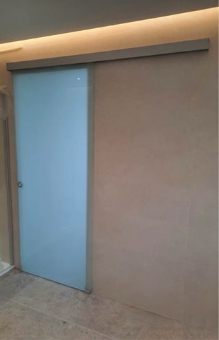 Vendo puerta corredera de vidrio templado satinado (cristal opaco) de alta calidad, ideal para interiores modernos, baños, vestidores, despachos o para separar ambientes. La puerta mide 108 cm de ancho por 235 cm de alto y el vidrio tiene un grosor de 12 mm, por lo que es muy robusta y de gama alta. Se entrega con todo el sistema completo: riel superior de aluminio, carros con rodamientos, guía inferior, topes de final de recorrido, tapa decorativa y tirador de acero inoxidable. Es una puerta pesada, elegante y de calidad profesional, no es un modelo barato ni de bricolaje.
