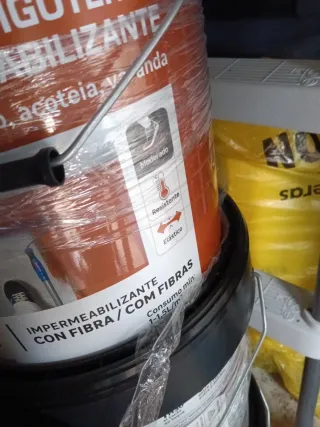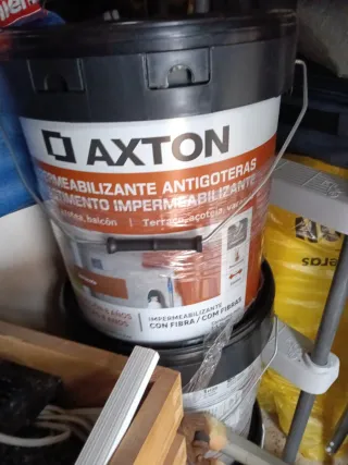 Pintura impermeabilizante Axton antigoteo, ideal para terrazas y balcones. Protege contra goteras y humedades. - Impermeabilizante antigoteras. - Para terrazas, balcones y azoteas. - Con fibra para mayor resistencia. - Consumo: 1-1.5L/m². Tengo dos botes iguales, comprado hace un mes. Precio x los dos.