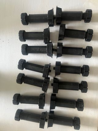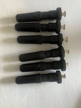 Conjunto de seis patas negras para muebles. Son de plástico y tienen un diseño cilíndrico. - Color: Negro - Material: Plástico - Cantidad: 6 unidades zona de recogida en persona y pagos exclusivamente en efectivo TALAMANCA Marina Botafoch, detrás del Hotel corso