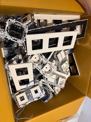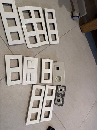 Lote de enchufes e interruptores, todos con su mecanismo. - Mecanismos de interruptores. - Enchufes. - Marcos de montaje. - Teclas de persianas ...
