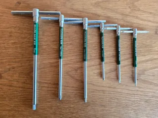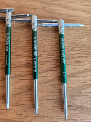 Juego de llaves Allen en forma de T deslizantes, tipo Park Tool, KS Tools o Beta. Medidas de 2 mm a 6 mm. - Medidas: 2mm, 2.5mm, 3mm, 4mm, 5mm, 6mm. - Con posición lateral y media de la barra de la T. - Con camisa para facilitar la rotación.