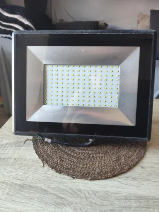Foco LED de exterior con un diseño moderno y resistente. - Panel de 100 LEDs. - Marco metálico plateado. - Cableado expuesto.