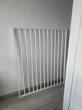 Puerta de hierro blanca con diseño de lamas horizontales. Ideal para exteriores o interiores Medidas 80 x 215 - Material: Hierro. - Color: Blanco. - Diseño: Lamas horizontales.