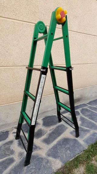 Escalera extensible de múltiples usos, ideal para diversas tareas. Altura totalmente plegada, 1 metro desde el peldaño superior hasta el suelo, y totalmente abierta 1,80. Tiene 4 posiciones de altura, con fijaciones de seguridad. - Construcción robusta en verde y negro. - Diseño plegable para fácil almacenamiento.