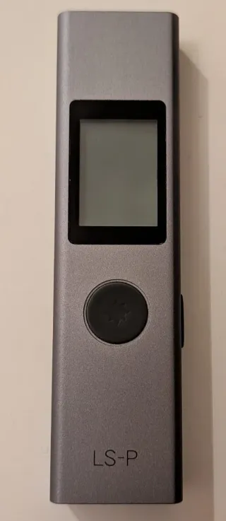 Telémetro láser AUBEST modelo LS-P. Dispositivo compacto y ligero con pantalla digital. - Carga USB. - Cuerpo de aluminio gris. - Botón de control circular con diseño. - Pantalla LCD.