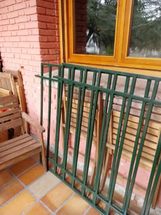 Conjunto de rejas metálicas huecas de seguridad de color verde carruaje para sus ventanas. Como nuevas (compradas hace 2 años) pero con marcas a nivel de los tornillos, como se puede apreciar en las fotos. Los tornillos eran como en la última foto (no incluidos). 70€ cada una. Medidas: -- Rejas 1: 120cm largo x 120cm alto x 6cm patas tornillos (2cm profundidad barrotes) -- Rejas 2: 148,8cm largo x 120cm alto x 6cm patas tornillos - Estructura de metal resistente. - Diseño con barrotes verticales.