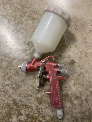 Pistola pulverizadora de pintura con depósito. - Cuerpo metálico en color rojo. - Depósito de plástico blanco. - Gatillo y ajustes metálicos.