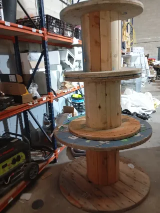 Se venden bobinas de madera, ideales para decoración o proyectos. - Hay 2 de 80 centímetros de diámetro por 60 centímetros de altura y 1 de 110 cm de diámetro y 70 cm de alto, en muy buen estado - Precio por las tres - Material: Madera. - Estructura robusta.