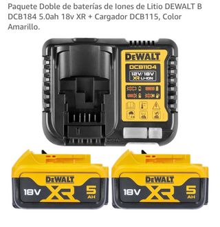 Se vende paquete de dos baterías DeWalt DCB184 de 5.0Ah y 18V XR, junto con un cargador DeWalt DCB115. - Baterías de Iones de Litio. - Cargador compatible con baterías DeWalt 12V/18V XR LI-ION. - Color Amarillo.