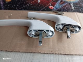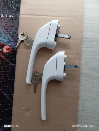 Se venden dos manillas para ventanas de PVC, cada una con su llave correspondiente. - Color blanco. - Incluye dos llaves. - Mecanismo de cierre con llave. Precio unitario: 6€. Las dos por 10€.