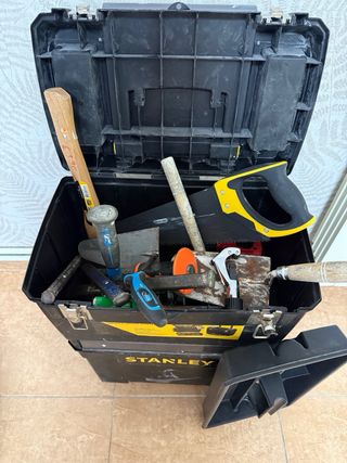 ¡¡OFERTA ÚNICA: lote de herramientas!! ¿Que contiene? 😀 - Caja STANLEY Mobile Work de 2 compartimientos (VENDIDO!!) - 2 grapadoras manuales (Compatible con grapas 28 y 36 (10-14mm)) - 1 hacha - 1 sierra - 1 maceta de goma - 2 corta tubos de cobre y latón - 1 paleta SE PUEDE VENDER POR SEPARADO TAMBIÉN