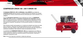 Precio definitivo. Compresor de aire marca Metal Works, modelo Orion 100. Diseñado para ofrecer un rendimiento fiable. - Depósito de 100 litros. - Motor potente y duradero. - Ruedas para facilitar el transporte. Ha trabajado muy poco tiempo. Más detalles en fotos. Recogida por el comprador en Sant Feliu de Llobregat. Precio final. Incluye el carrito con rollo tubo neumático de la primera foto, todo 200€.