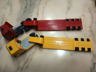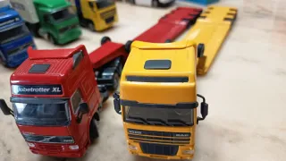 Se venden dos camiones de juguete tipo plataforma. Uno es de color rojo y el otro amarillo + 2 escavadoras - Camión rojo con detalles Globetrotter XL. - Camión amarillo con detalles DAF. - Remolques de color rojo y amarillo. - Se pueden excluir las escavadoras!!!! - Se escuchan ofertas!!