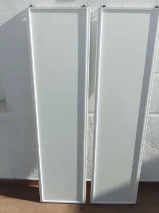 Se venden dos puertas correderas de color blanco. - Acabado liso. - Marco metálico. - Bisagras negras en la parte superior e inferior.