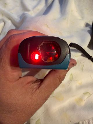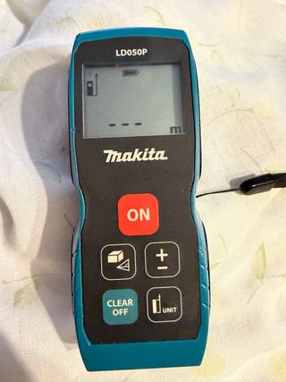Medidor láser de la marca Makita, modelo LD050P. Dispositivo compacto y fácil de usar. - Pantalla digital. - Botón de encendido/apagado. - Indicador de batería.