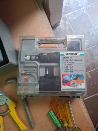 Se vende caja de herramientas con varias herramientas de mano. Está en buen estado. - Incluye martillo, cinceles, alicates, destornilladores, espátula y metro. - La caja es de plástico resistente. - Ideal para pequeños trabajos de bricolaje.