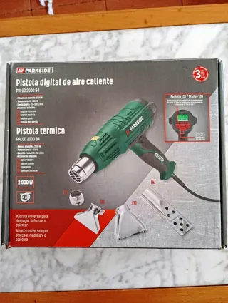 Pistola de aire caliente digital Parkside PHLGD 2000 B4. - Potencia de conexión: 2000 W - Temperatura: 50-650 °C - Caudal de aire: 150-500 l/min - Incluye 4 accesorios: boquilla reductora, boquilla espátula, boquilla plana y boquilla para parrilla. - Pantalla LCD para ajuste preciso de la temperatura. - Cable de 4 metros.
