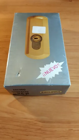 Escudo de seguridad Ezcurra modelo 424P. - Acabado en latón dorado. - Incluye tornillería y embellecedor. - Se aprecia por la parte de dentro señales de llevar tiempo almacenado