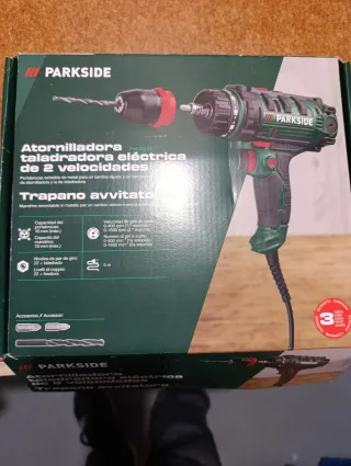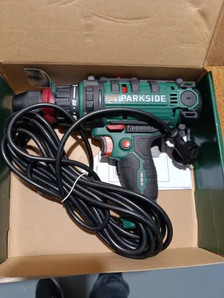 Atornillador y taladradora eléctrica Parkside con portabrocas extraíble de metal. - Dos velocidades de giro: 0-400 rpm (1ª marcha) y 0-1600 rpm (2ª marcha). - Niveles de par de giro: 22 + taladrado. - Capacidad del portabrocas: 10 mm (máx.). - Incluye accesorios y cable de 5 m.