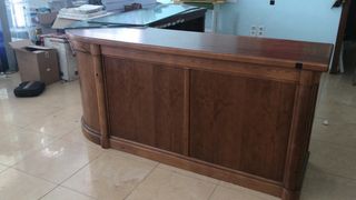 Mostrador de madera con diseño curvo y superficie de cristal. - Material: Madera - Forma: Curva - Superficie: Cristal