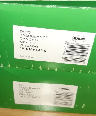 40 unidades de Taco basculante de acero cincado nuevos sin uso y con sus cajas. Ideales para sujetar lámparas, bandejas, decoración en techos de escayola, pladurld, etc... Medida: M6X100, Material: Acero cincado. Están nuevos y son de alta calidad...Cada caja trae 10 unidades con dos tacos cada uno. Total caja 20 unidades y vendo 2 cajas enteras.