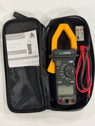 Pinza amperimétrica KPS-PA10 en color gris y amarillo. Incluye cables de prueba y una pila. - Pinza amperimétrica KPS-PA10 - Cables de prueba (rojo y negro) - Pila GP Supercell