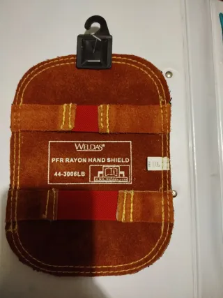 Escudo protector para soldar de la marca Welds. - Fabricado en fibra de vidrio. - Modelo: 44-3009BF. - Diseño con correas de cuero y tela roja.