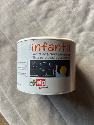 Pintura de pizarra para pared de la línea infantil de Alp Pinturas. Ideal para crear superficies de escritura. - Acabado mate. - Fácil limpieza con agua y jabón. - Alta resistencia. - Cubre 5m².