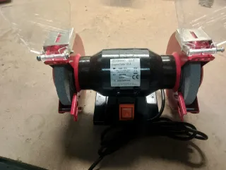 Esmeril de doble disco Monzana. - Modelo: DBSM010 - Voltaje: 230V~50Hz - Potencia máxima de entrada: 250W - Velocidad: 2980 RPM - Diámetro del disco: Ø125x16xØ12.7mm - Fabricado en Alemania