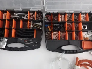Lote de herramientas y accesorios para reparaciones o proyectos. - Caja organizadora con compartimentos. - Válvula de fontanería. - Manguera de gas naranja. - Tubo flexible blanco. - Bisagra metálica. - Patas negras para mueble. - Tornillería y tacos surtidos. - Varilla extensible con mango azul.