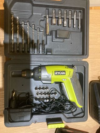 Atornillador eléctrico Ryobi de 4V con su maletín y accesorios (cable del cargador roto) - Incluye cargador. - Variedad de puntas para atornillar. - Brocas para taladrar.