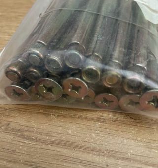 Lote de 18 tornillos de anclaje metálicos. - Medidas: 6x90 mm. - Acabado plateado y dorado iridiscente. Artículos de ferretería tras cierre por jubilación. Envio solo por correos.