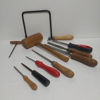 Conjunto de diez herramientas para trabajar la madera. - Mazo de madera. - Segueta de marquetería. - Escofinas y limas de diferentes tamaños. - Formones con mangos de madera y plástico.