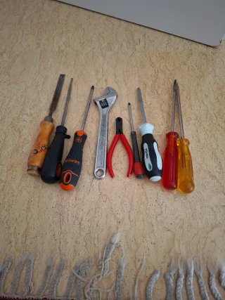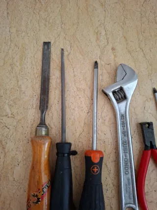 Conjunto de herramientas manuales variadas, ideal para reparaciones y bricolaje. - Incluye llave inglesa ajustable. - Variedad de destornilladores. - Alicates de corte. - Formón.