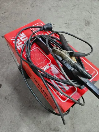 Soldador de electrodo para trabajos de soldadura. - Carcasa roja. - Incluye pinzas y cables de conexión. - Enchufe europeo.