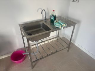Fregadero de obra con estructura metálica y cubeta. - Material: Acero inoxidable. - Incluye grifo y desagüe. - Estante inferior para almacenamiento. - Medidas: 101cm de largo, 50cm de ancho y 77cm de alto Solo tiene para una toma de agua (fría o caliente). Se incluye latiguillo. Se ha utilizado 1 mes hasta colocar la cocina. Se adquirió en Amazon para obra pero no se utilizo.
