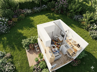 Kalima Cube Prime: Todo lo esencial en 6.33 m2 Refugio compacto 10 pies con cama plegable/sofa, escritorio integrado, mini cocina (encimera + fregadero), baño completo (ducha, WC, lavabo). Estructura desmontable Mecano, aislamiento pasivo natural, techo panal hidrófugo con cámara 2 mm, ventanas grandes y acabados madera clara. Reversible, portátil y sostenible. Ideal para jardín, terraza o rincón privado. Personalízalo con extras: Paneles Fresh o Pozo Canadiense. ¡Tu oasis completo y autónomo! - Estructura robusta y duradera. - Paneles solares integrados en el tejado. ¿Quieres saber más? Escríbenos
