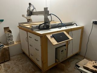 Fresadora CNC a estrenar para fresas de diametro 3 y 8 mm con motor de 150 W y eje Z . Puedes acoplarle un laser de 10 W opticos capaz de cortar madera de 10 mm y compresor de aire para q no se queme la madera, mira mi perfil. superficie de trabajo 1000x1000 mm, 1 m2. Utilizada 2 veces.