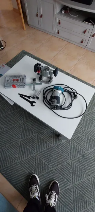 Fresadora Makita con su mesa de trabajo. - Ideal para carpintería y trabajos de madera. - Incluye la fresadora y la mesa. - Montaje robusto para mayor estabilidad.