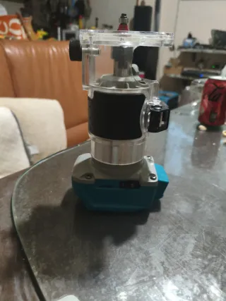 Fresadora de sobremesa con motor Makita. - Base metálica robusta. - Guías verticales ajustables. - Asa de manejo ergonómica.