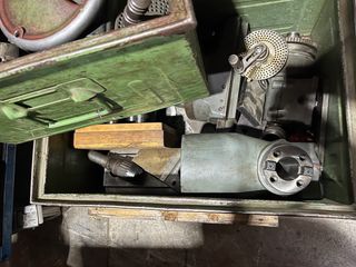 Se vende fresadora con varios accesorios. - Incluye caja de madera con herramientas. - Piezas metálicas de diferentes tamaños. - Componentes de la máquina en color verde y gris.