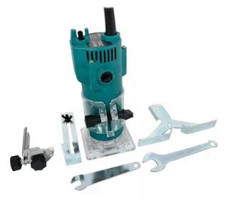 Fresadora eléctrica compacta, ideal para trabajos de carpintería y bricolaje. Incluye varios accesorios para diferentes tipos de cortes y acabados. - Cuerpo principal de plástico y metal. - Base transparente para mejor visibilidad. - Incluye llaves y guías. - Mango ergonómico.