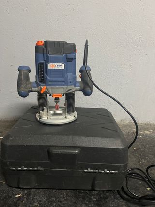 Fresadora o router profesional para trabajos de carpintería. Ideal para dar forma y acabados a la madera. - Estructura robusta de metal. - Mango ergonómico para un mejor agarre. - Base ajustable para diferentes tipos de corte.