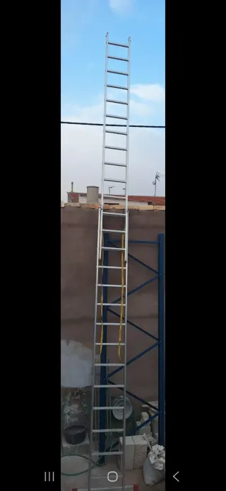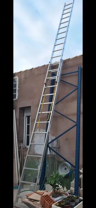 Escalera extensible de aluminio, ideal para trabajos en altura. Es ligera y fácil de transportar. - Fabricada en aluminio resistente. - Diseño extensible para mayor alcance. - Incluye cintas de seguridad amarillas.3,90m plegada y 7 metros abierta.venta en persona en provincia de Toledo.CAMUÑAS.
